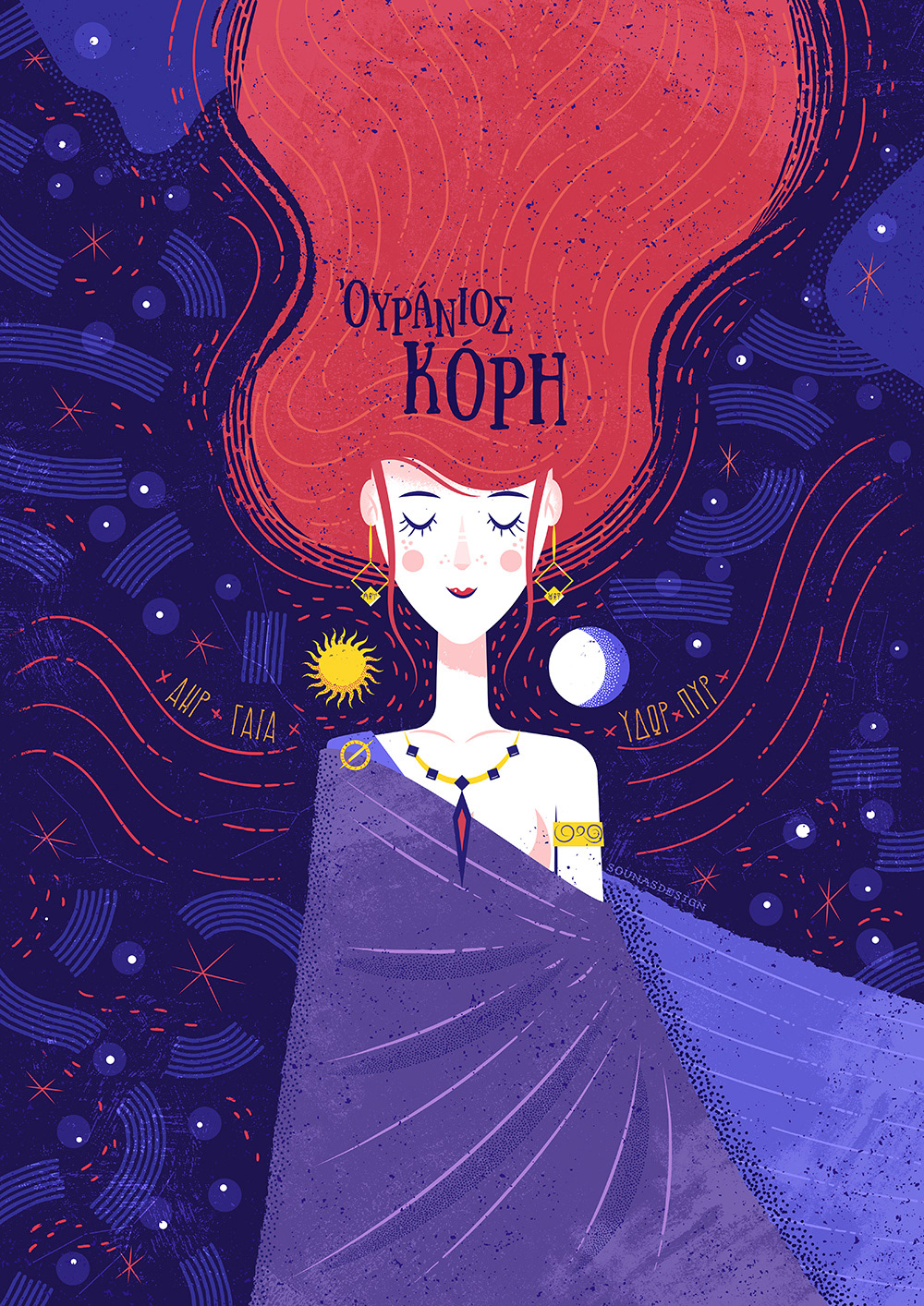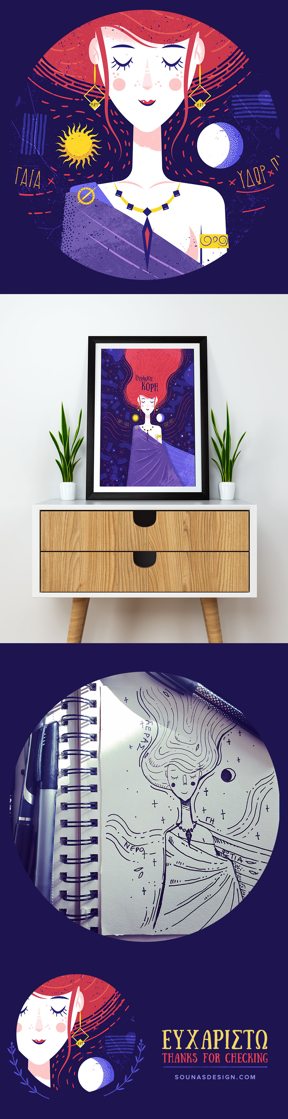 illustration of dreaming girl, space, sky, universe, ancient greece,